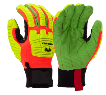 Polyester cut-resistant liner for comfort and breathability. Durable corded cotton palm delivers excellent grip in oily conditions. Custom-designed level 1 impact protection. High-visibility back of hand for recognition. Thumb saddle increases additional durability and grip. Adjustable cuff creates a secure fit to keep out debris.