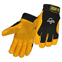Premium dyed cow leather Black spandex on back Split reinforcement on palm & thumb Hook and loop closure
