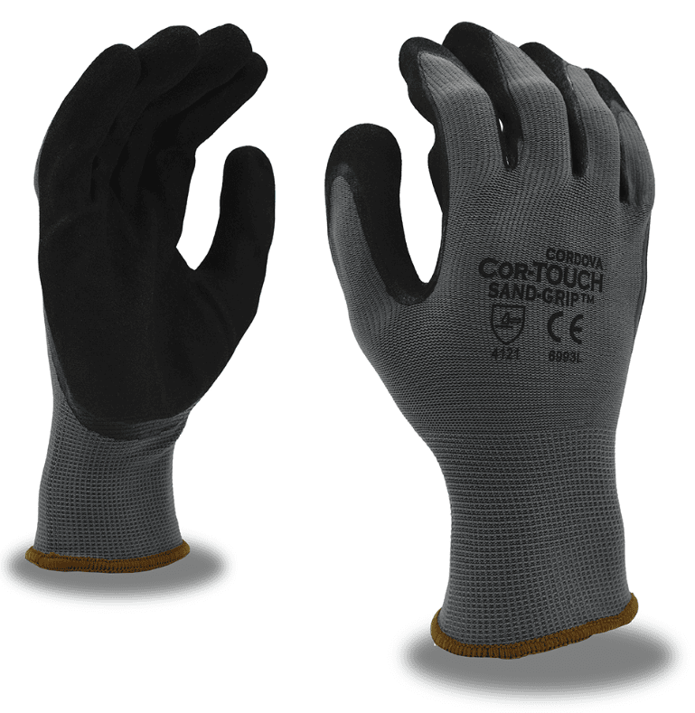 Nitrile is an oil-resistant, synthetic rubber that is abrasion-, snag-, and puncture-resistant. Machine knit, nitrile-coated gloves are incredibly durable and offer excellent sense of touch. Flat nitrile coatings are smooth, shiny and liquid-resistant. This Cordova Safety Products-brand COR-TOUCH SAND-GRIP™ glove features a 13-gauge, gray, polyester shell and black, sandy nitrile palm coating.